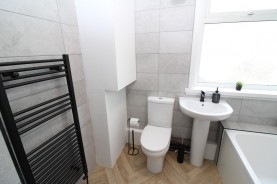 UPVC frosted double glazed window to the rear aspect, bath with shower over, wash hand basin, toilet, fitted cupboards with one housing the boiler